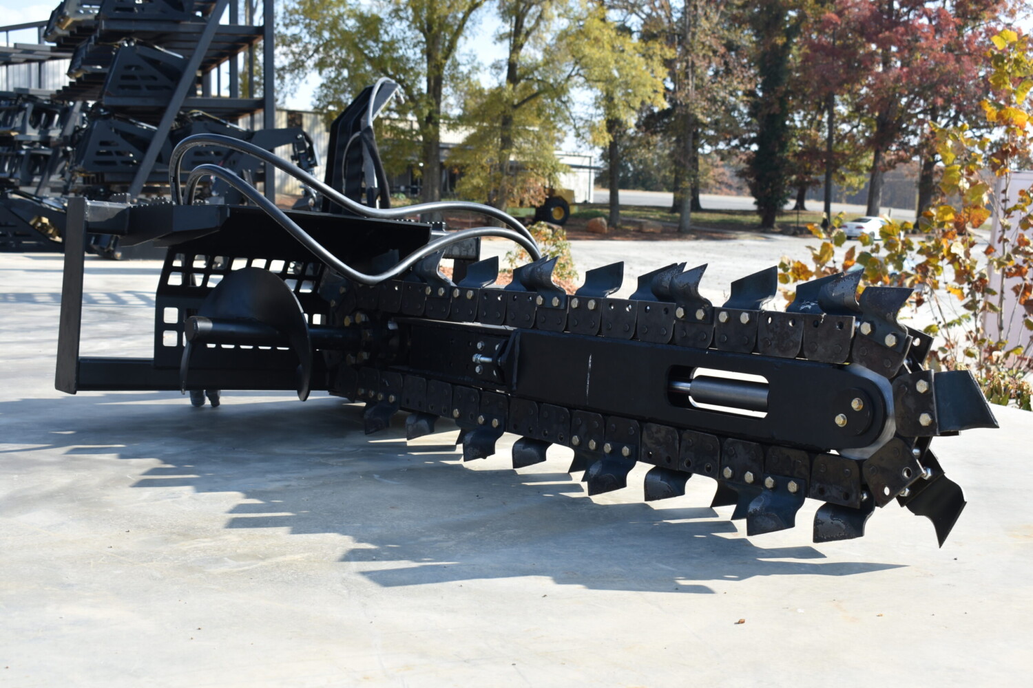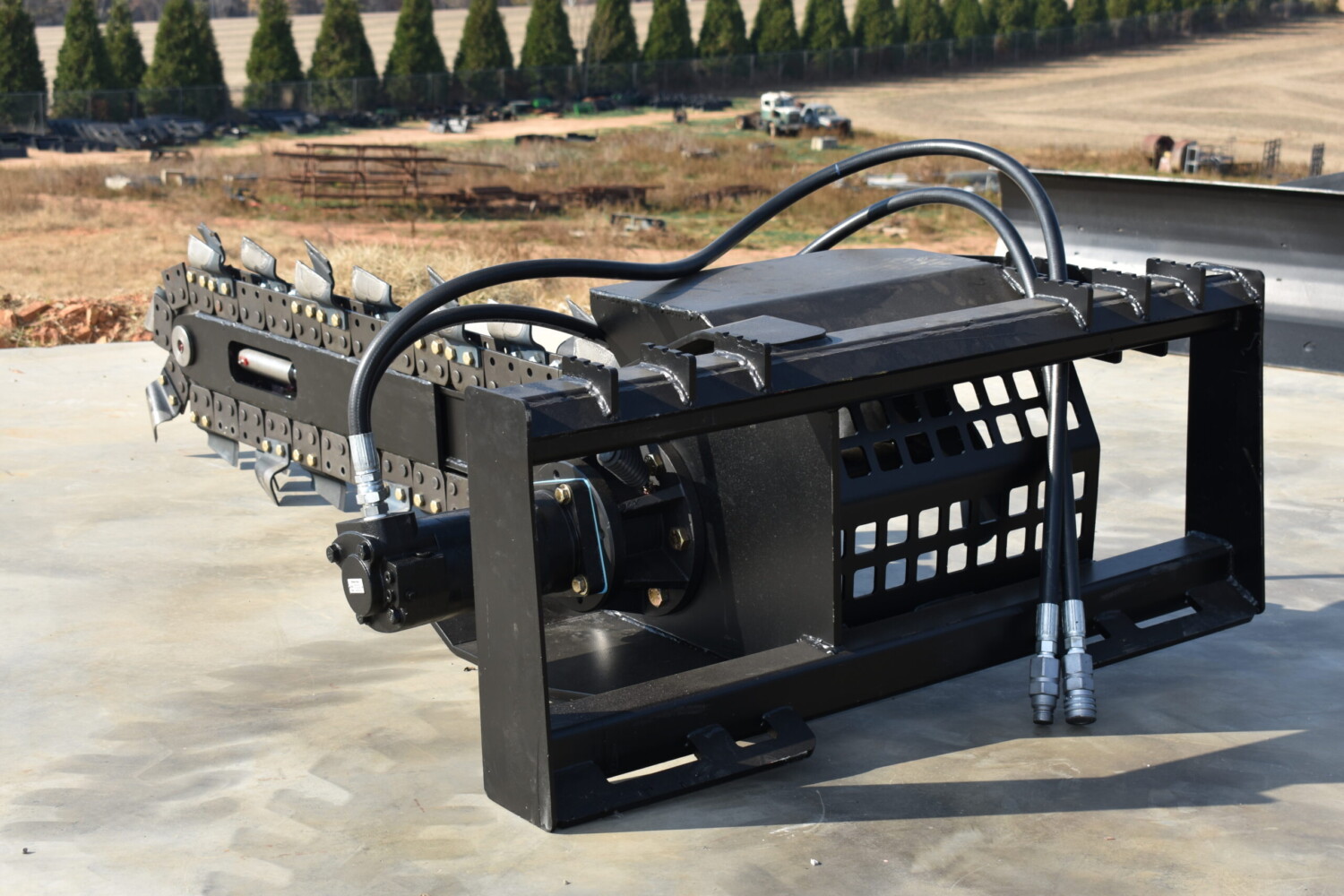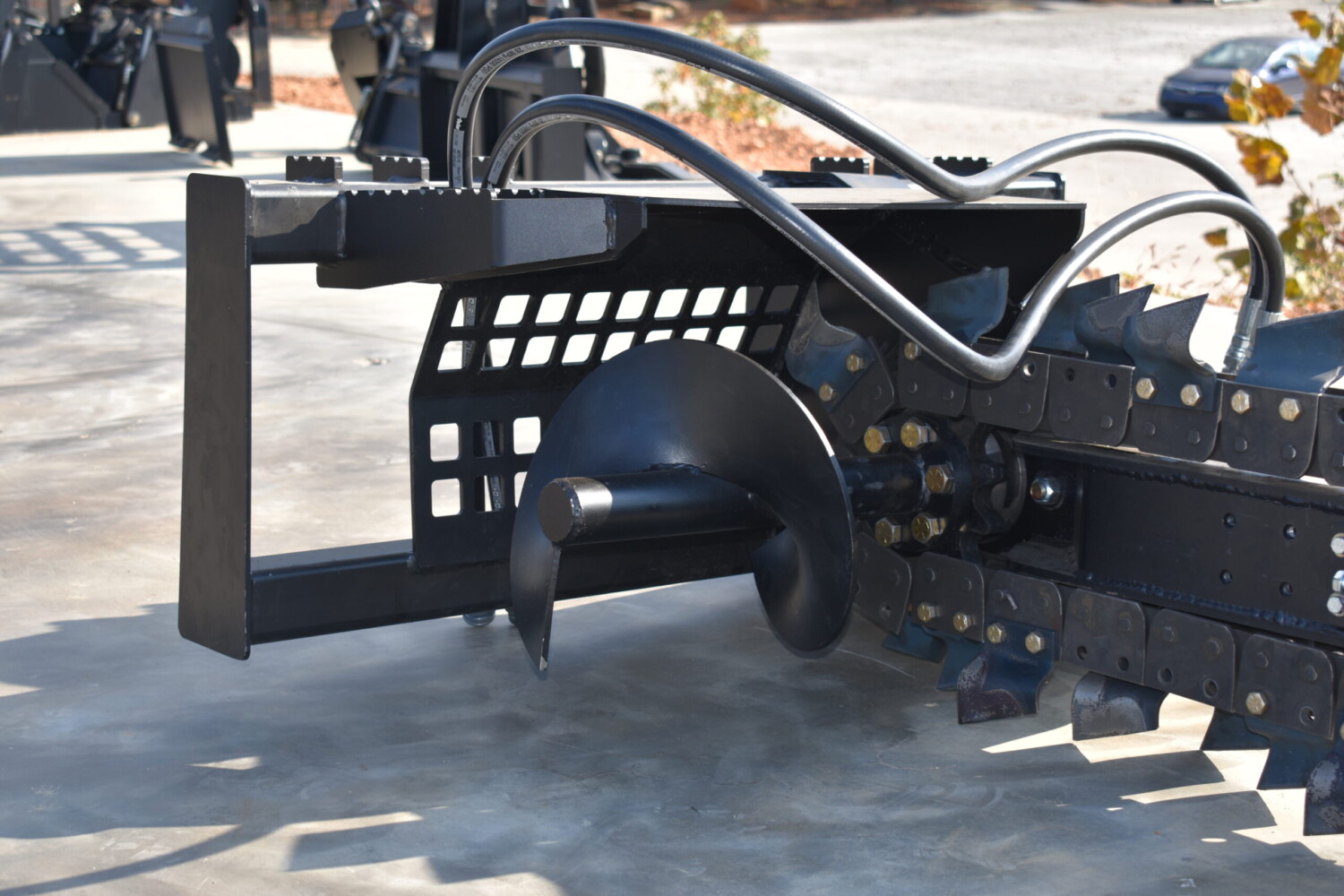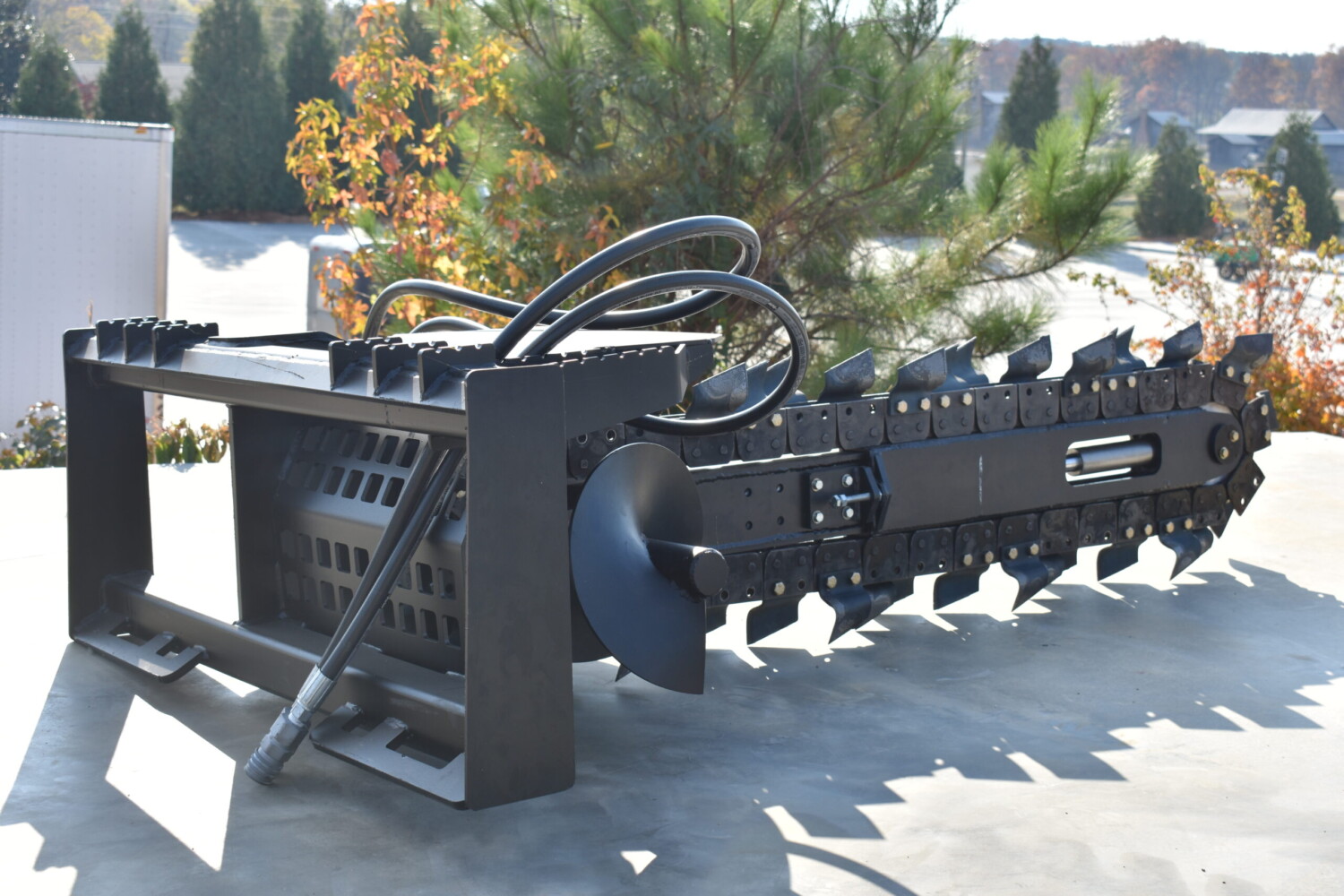 This skid steer trencher delivers unmatched power and precision for tough digging jobs. Its planetary drive delivers high torque for fast trenching, while the Dirt Tooth chain cuts through hard ground with ease. Built to last with an Ultra HD bearing, oversized auger, and quick-adjust side shift for maximum versatility.